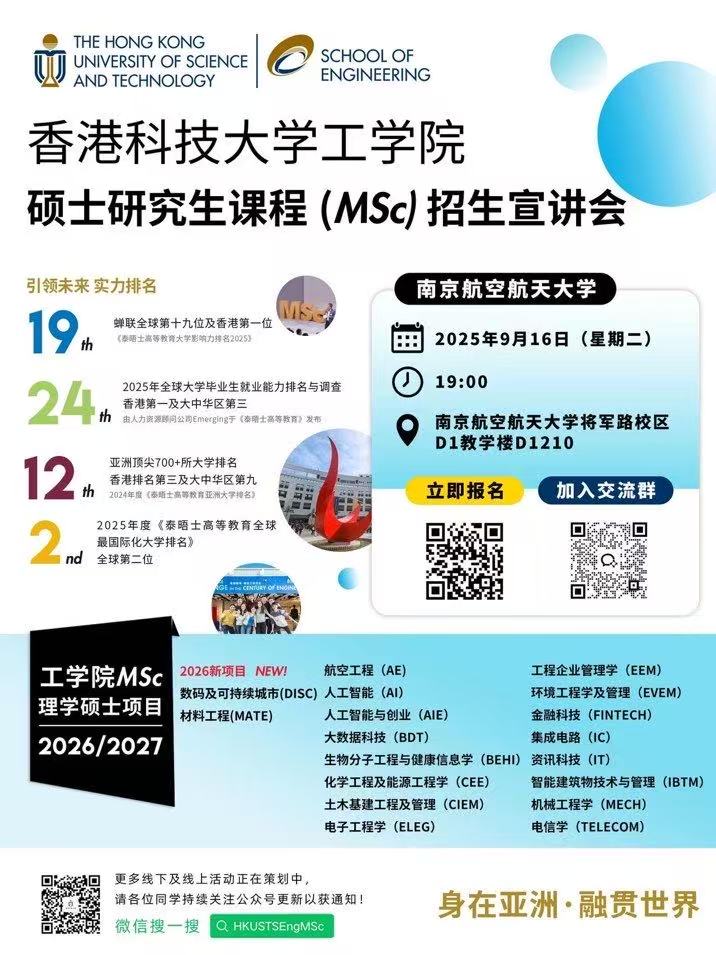 香港科技大学工学院2026/2027年度硕士研究生(MSc)项目招生宣讲会——南航专场